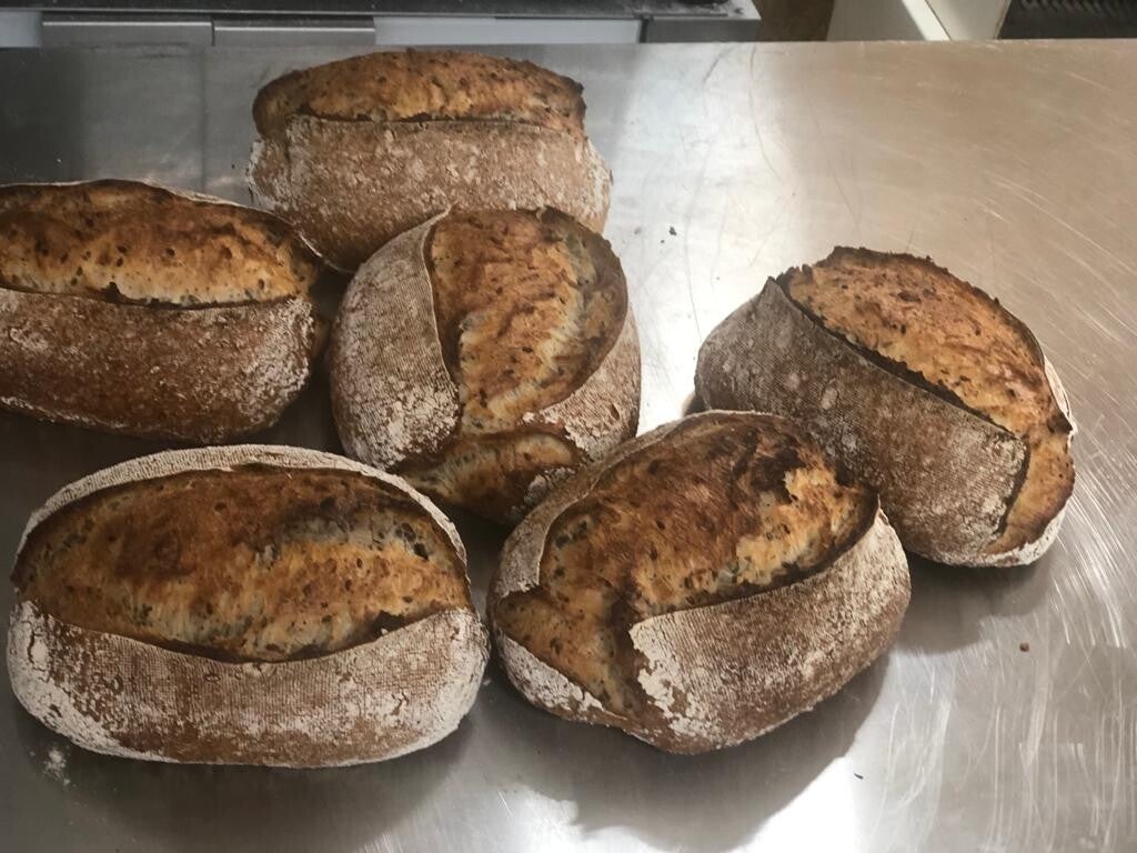 Meergranen is een hardloper hier in bakkerij. Deeg is samenstelling van tarwe en rogge bloem, gevuld met combinatie van granen en zaden. De vulling is haast nooit hetzelfde omdat ik zelf van alles bij elkaar mix. In ieder geval zit er ruim voldoende aan lijn- en maanzaad, zonnebloempitten, havervlokken....etc...etc.